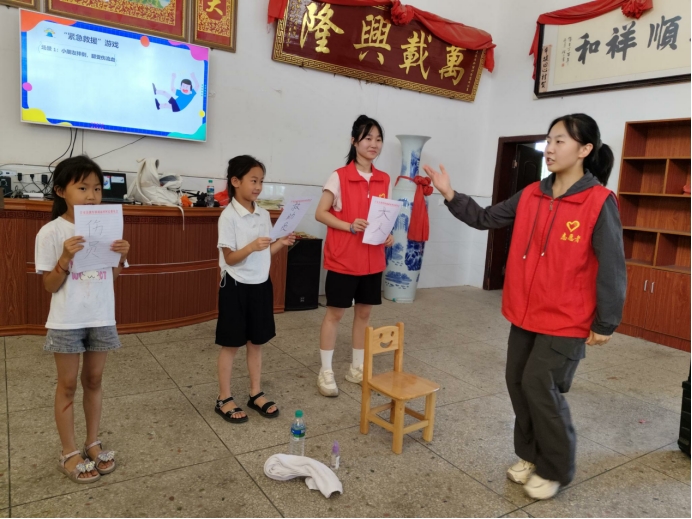 为帮助孩子们更好地了解不同的职业世界,激发他们对未来的憧憬,实践队为孩子们开启了职业启蒙之旅。队员们首先与孩子们亲切交流,引导他们畅谈自己未来的职业规划,了解孩子们内心对职业的初步认知与向往。随后,队员们组织了生动的情景剧扮演活动,通过模拟患者摔伤时的急救演练,让孩子们扮演医生、护士、患者等角色,亲身体验医护人员在紧急情况下的专业操作与沉着应对。在同伴落水如何施救的情景中,孩子们分别扮演施救者与落水者,学习如何正确呼救、利用工具救助以及上岸后的初步急救措施,让他们明白每一种职业在面对危险时的责任与自身安全。孩子们在实践中了解到不同职业的责任与担当,为他们未来的职业规划埋下伏笔。