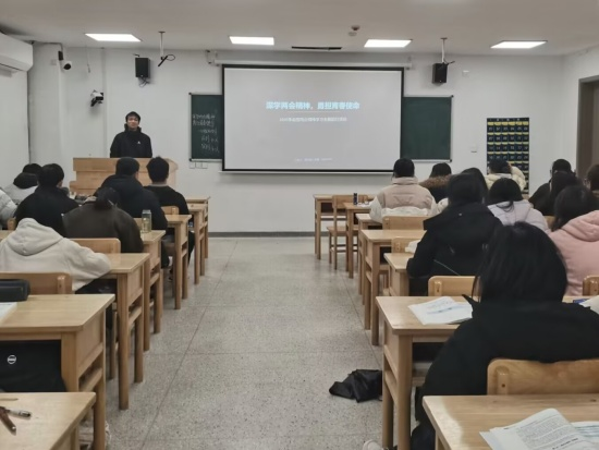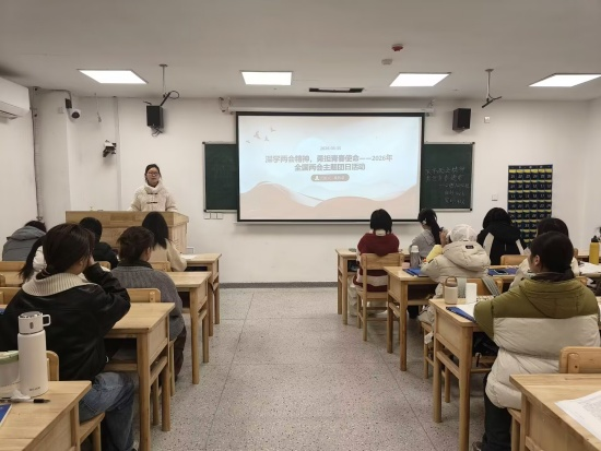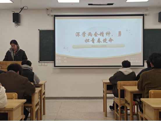 在研究生楼330教室,A2341班团支书彭瑾昱聚焦“青年担当”与“健康中国”主题开展学习活动,带领同学们重温两会重要内容,引导大家立足医学专业实际,感悟“十五五”时期健康中国建设赋予医学生的历史重任。