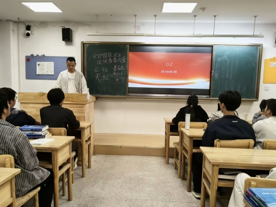 在研究生楼330教室,A2342班团支书刘宏鼎带领同学们围绕校园反诈、生物安全、意识形态安全等内容展开学习。随后,他组织大家签订了维护国家安全承诺书,引导同学们以实际行动践行青春担当。