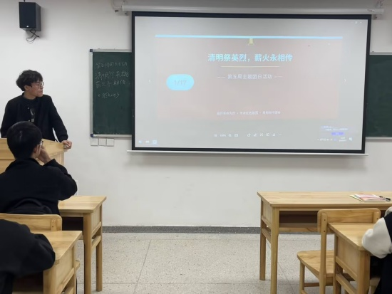 在教学楼B505教室,口腔A2413班团支书祝天威通过英烈事迹学习、红色历史重温及线上线下缅怀等形式,带领同学们追忆革命先辈的峥嵘岁月。他引导同学们感悟先烈坚定的理想信念与无私奉献精神,让大家在致敬中接受爱国主义教育,深刻体会平安生活的来之不易。