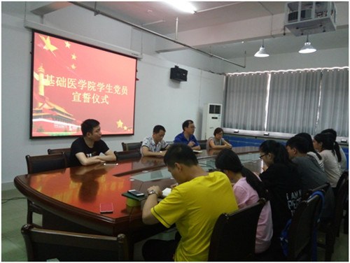 | 6月28日下午,基础医学院学生党支部新党员宣誓仪式在华文楼105圆满举行。基础医学院党委书记余朝阳出席宣誓仪式,学生科副科长张波,辅导员徐霖、邓琴老师以及学生预备党员邓奕婷,徐奖,吴子霞,余茜同学参加宣誓仪式。党支部书记张波老师主持仪式。   仪式在神圣庄严的《国际歌》乐曲中拉开了序幕,同志们在歌声中怀念先辈,勉励自己。歌曲演唱完毕后,由徐霖老师带领全体新党员面对党旗,举右拳,进行庄重而严肃的宣誓仪式。接下来便进入到预备党员的发言环节,邓奕婷同学代表新党员表达了入党的激动心情,重新陈述了入党动机,并保证会遵守自己的誓言,努力学习,用自己所学的知识为人民服务。   余朝阳书记代表学院党委对四位新党员表示欢迎,并强调党的纪律性和组织性,强调党员的责任义务,表达了对新党员的殷切希望和充分的信任。  此次仪式不仅仅标志着党员队伍新鲜血液的注入,更激励各位新党员们以饱满的热情和伟大的责任意识投入到党的建设中去,为党的事业尽自己的一份绵薄之力。 |