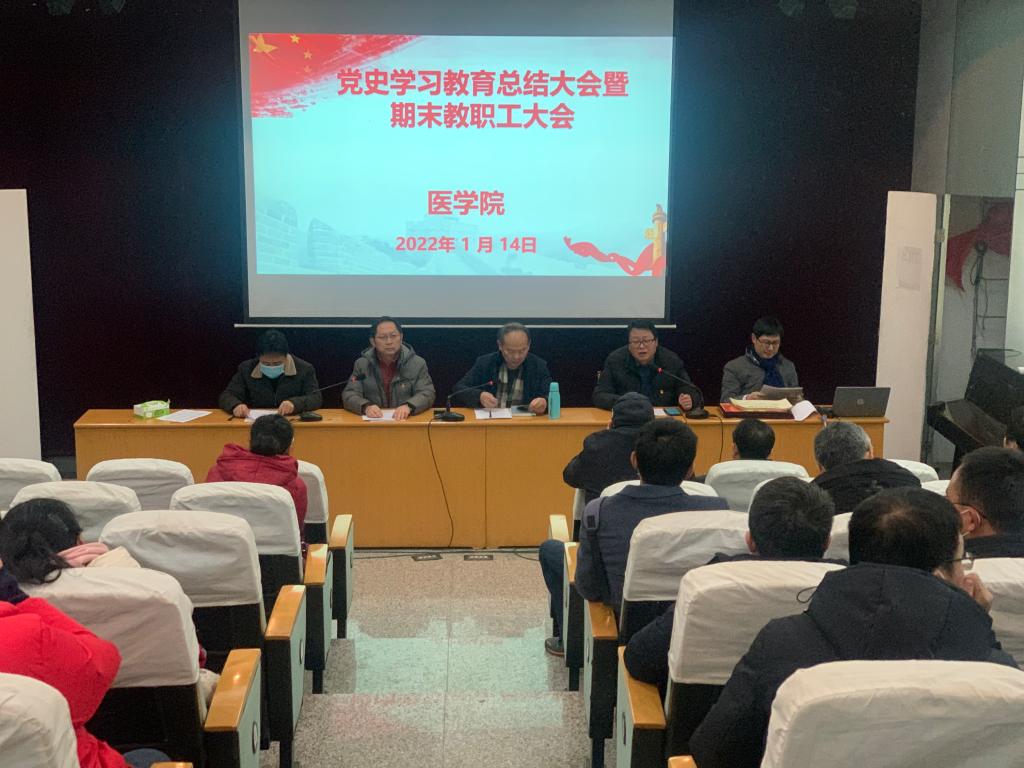 会上,院长车向新向医学院全体教职工传达了中央、省委、市委和学校党史学习教育总结大会精神。强调指出,要深入学习贯彻习近平新时代中国特色社会主义思想,学习贯彻党的十九届六中全会精神,认真总结党史学习教育的成功经验,求实、务实、扎实,建立常态化、长效化制度机制,不断巩固拓展党史学习教育成果。同时传达了陈小林校长在全校干部大会上的讲话精神,总结了医学院2021年度工作并布置寒假各部门相关工作。党委书记许晓源就医学院党史学习教育工作进行了汇报总结。他指出,自从开展党史学习教育动员以来,医学院积极推动、不断加强全院师生的党史学习教育,开展了参观红色教育基地党日活动,看望革命老战士,举行党史知识竞赛、绘画、朗诵、’红色走读”、”我为群众办事实“等系列实践活动,成绩显著。希望全体教职工继续加强学习,在提高办学水平、提升医学生培养质量等方面做出贡献。