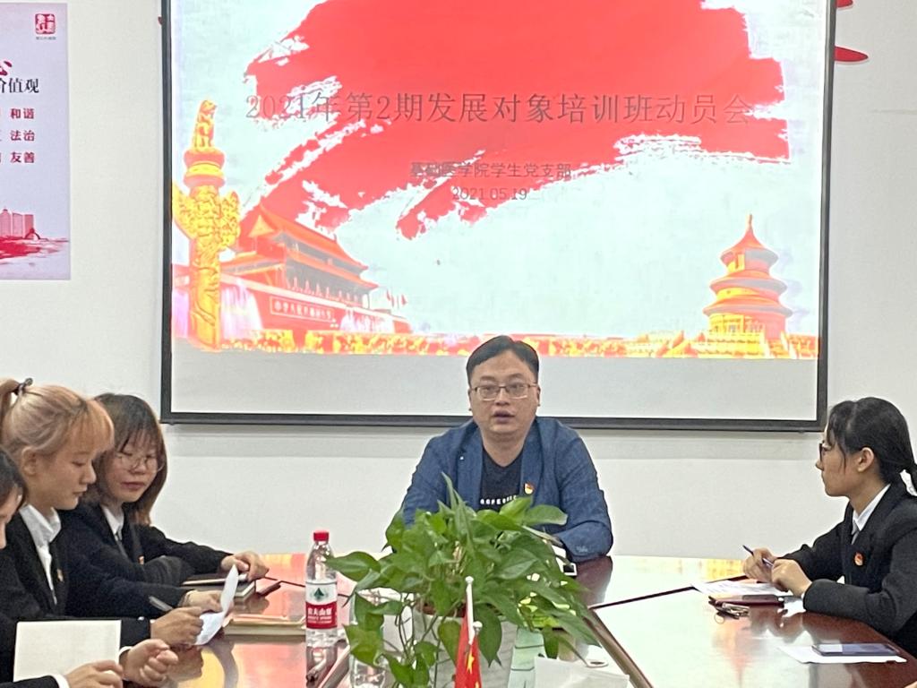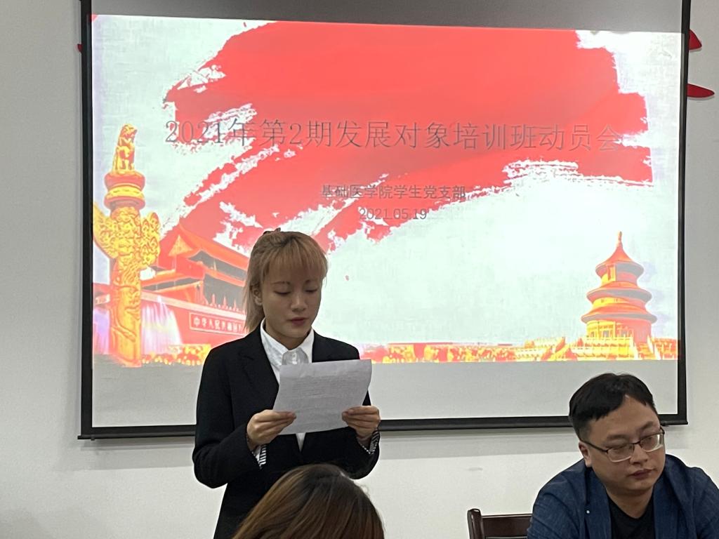 5月19日,基础医学院学生党支部在华文楼105会议室召开2021年第2期发展对象培训班动员会。全体学生党员及发展对象参加,此次动员会由学生党支部书记黄涛主持。