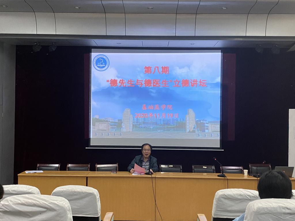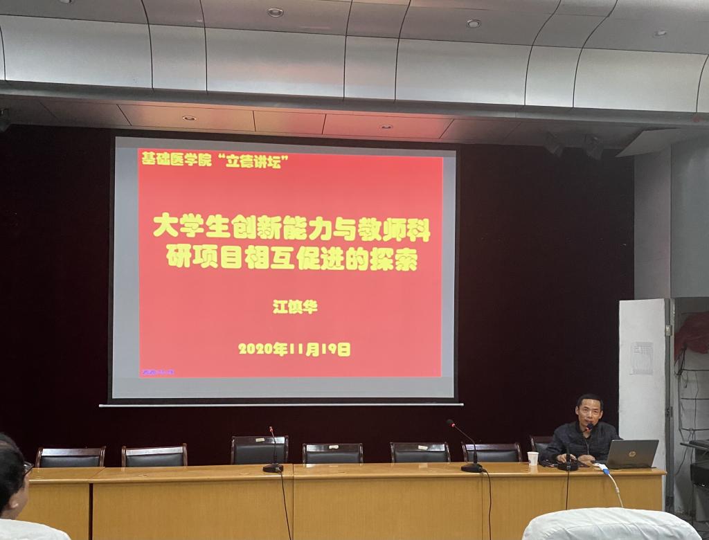 11月19日,基础医学院在立本楼报告厅举行了第八期“德先生与德医生”立德讲坛,邀请了“立德树人”楷模获得者、药学与生命科学学院教授江慎华博士担任主讲嘉宾,全院教师和学生代表参加学习,现场气氛热烈,掌声连连。本次讲坛由党委书记余朝阳主持。