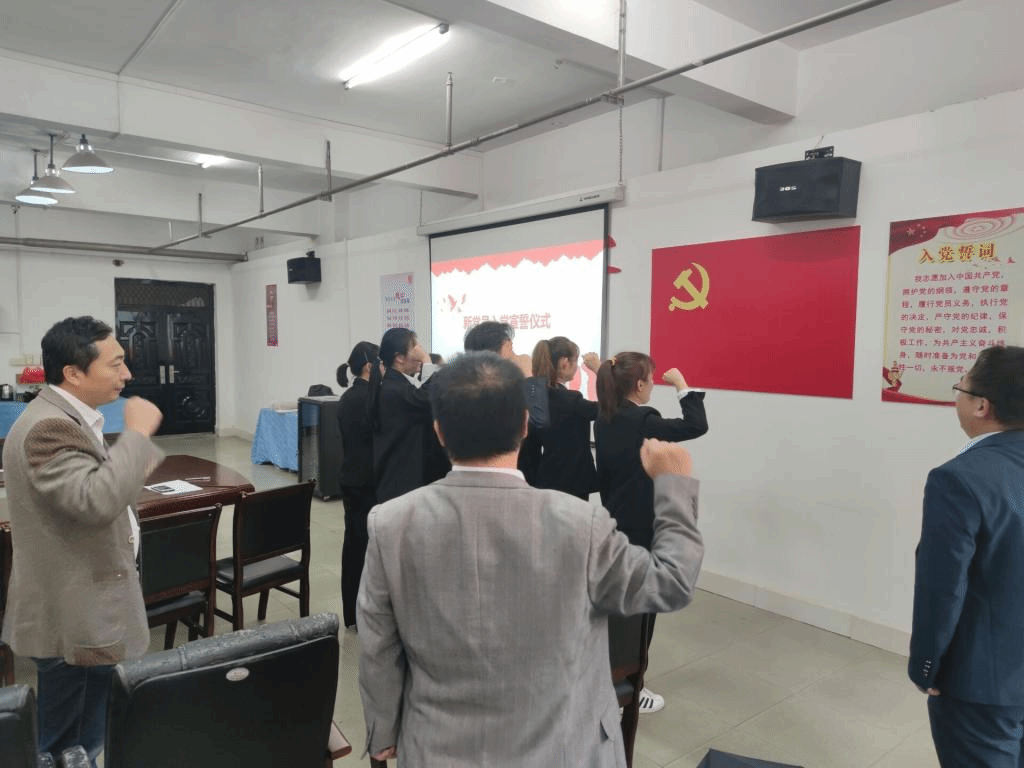龚帧、李美秀两位老师给新党员佩戴党徽,并且在黄涛的带领下,新党员进行了入党宣誓;老党员重温了入党誓词。面对着党旗,大家接受了一次身心的洗礼,举起的右手是他们肩负起的重担,而口中的誓词更是他们决心的见证。