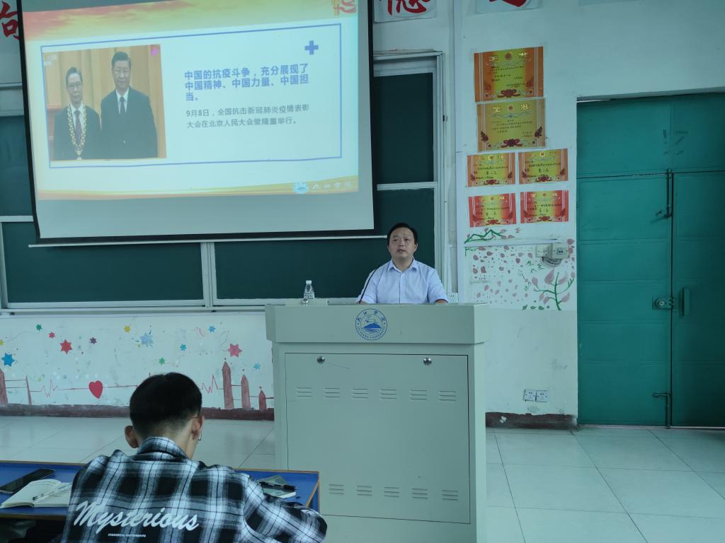 紧接着,老师们便从“新时代、新境界、新理念、新学风”四个主题展开思政课宣讲。从新时代下的中国方位和伟大斗争对“新时代”这个主题进行阐述,指出青年大学生的责任和使命就是要传承和弘扬伟大的抗疫精神,而奋斗正是青年大学生的人生主题;“有理想、有本领、有担当”是老师们认为“新境界”的体现,他们提到在此次抗击疫情中青年一代不怕苦、不畏难、不惧牺牲,用臂膀扛起如山的责任,展现出青春激昂的风采,展现出中华民族的希望;随后老师们也提出作为当代大学生就应该树立自主学习的新理念、树立全面学习的新理念、树立创新学习的新理念;接着老师便说到要以“勤奋、严谨、求实、创新”来营造九院新学风。他们在原有学习基础和现有学习条件大致相同的前提下,学风的优劣,是大学学习任务完成得好与坏的关键。