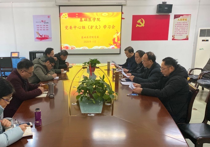1月11日下午,基础医学院在华文楼105会议室召开1月份党委中心组(扩大)学习会,专题学习贯彻习近平总书记在“不忘初心、牢记使命”主题教育总结大会上的重要讲话精神。会议由党委书记余朝阳主持,学院党委班子成员、各支部书记及各部门负责人出席了本次会议。