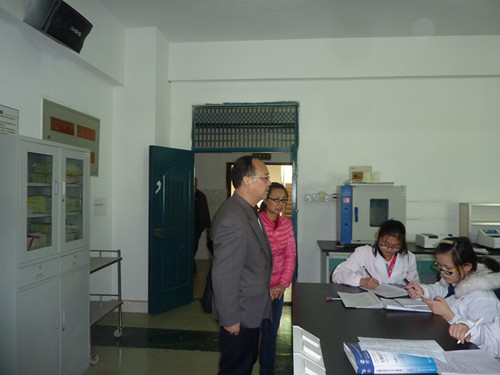 在基础医学实验楼,车院长认真检查走访各个楼层实验室,与实验员及老师交谈,强调一定要注重实验室安全,特别是用水用电安全,杜绝隐患。